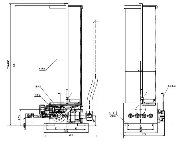 一、概 述 SRB-J1-4/4型手動干油泵適用于雙線式干油集中潤滑系統中,通過給油器向各潤滑點供送潤滑脂的手動潤滑泵。 SRB-J7-4/4型手動潤滑泵允許在0~40℃的環境溫度下工作,采用潤滑脂的針入度不低于265(25℃,150g)1/10mm。 二、形式、參數和尺寸 1、形式:SRB-J7-4/4型手動潤滑泵為帶有油位指示桿的手動柱塞式潤滑泵。 2、基本參數和外形尺寸: