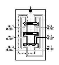 7、流入的潤(rùn)滑劑推動(dòng)活塞A 向右運(yùn)動(dòng)、右腔的潤(rùn)滑劑壓向NO.6吐出口,經(jīng)外部配管送向潤(rùn)滑點(diǎn)。當(dāng)活塞A移動(dòng)到至右極限時(shí)返回到初始1狀態(tài),繼續(xù)重復(fù)上述動(dòng)作。