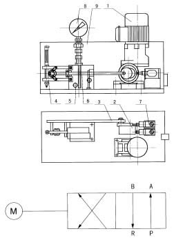 使用介質為錐入度不低于220(25℃,150g)1/10mm的潤滑脂(NLGI0#-3#)。 三、 工作原理 EM型電動換向閥主要由電動機,減速機構,偏心連桿機構,強簧機構,二位四通閥,限位開關,壓力表等組成。 電動機經蝸輪蝸桿減速后,由偏心輪2帶動連桿3 作直線往復運動。由于連桿末端所連動的彈簧機構4的作用,使二位四通閥5中的滑芯桿6產生急速的推拉動作,從而改變二位四通閥各油口的聯接方式,達到液流換向的目的。此時,偏心輪旋轉了180°到達另一個死點位置,觸動了限位開關7。限位開關即可送出脈沖信號,停止閥電機運行,完成了一個工作過程。壓力表8裝于防護罩9頂部用于監視閥內的工作壓力。