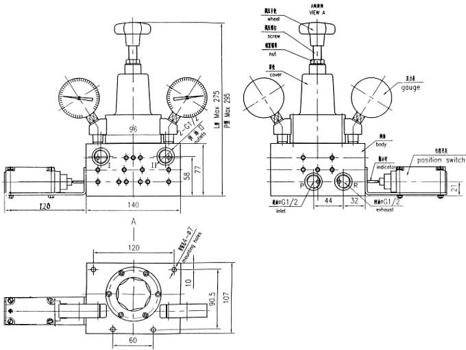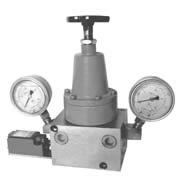 二、功能和結構說明 本閥為二位四通自動液壓換向閥,上平面設有兩塊壓力表和調壓手輪。換向壓力由手輪調節,順時針壓力升高,反之壓力降低。本閥門進油口P與泵出油口連接,回油口R接貯油桶,供油口Ⅰ、Ⅱ分別與兩條供油管路連接。工作時當Ⅰ路油壓達設定壓力,換向閥自動切換到Ⅱ路,這樣潤滑泵就能循環往復地向兩條管路供送潤滑脂。 三、技術參數