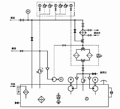本產(chǎn)品適用于裝有動靜壓軸承的磨機、軋鋼機、電機等大型設(shè)備的稀油循環(huán)潤滑系統(tǒng)中,其工作介質(zhì)為N22~N320(相當于ISO VG22~VG320)的各種工業(yè)潤滑油。 根據(jù)動靜壓潤滑工作原理,在啟動、低速和停車時用高壓系統(tǒng),正常運行時用低壓系統(tǒng),以保證大型機械在各種不同轉(zhuǎn)速運行下均能獲得可靠的潤滑以延長主機壽命。 稀油站的高壓部分壓力為31.5MPa,流量為2.5L/min,低壓部分壓力為0.4MPa;流量為16~125L/min,稀油站具有過濾、冷卻、加熱等裝置和聯(lián)鎖、報警、自控等功能。 該產(chǎn)品的性能參數(shù)及尺寸應(yīng)符合表和圖中的規(guī)定;裝置由油站、儀表盤、電控柜(可用PLC控制)成套組成。